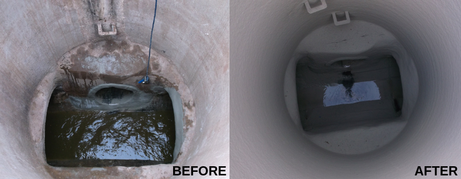 Prior to the M-Coating application, water ingress was identified and a specialist grout, Ergelit KBi was pumped into the structure of the chamber at the location of the leaks to fill any voids and stem all water ingress.